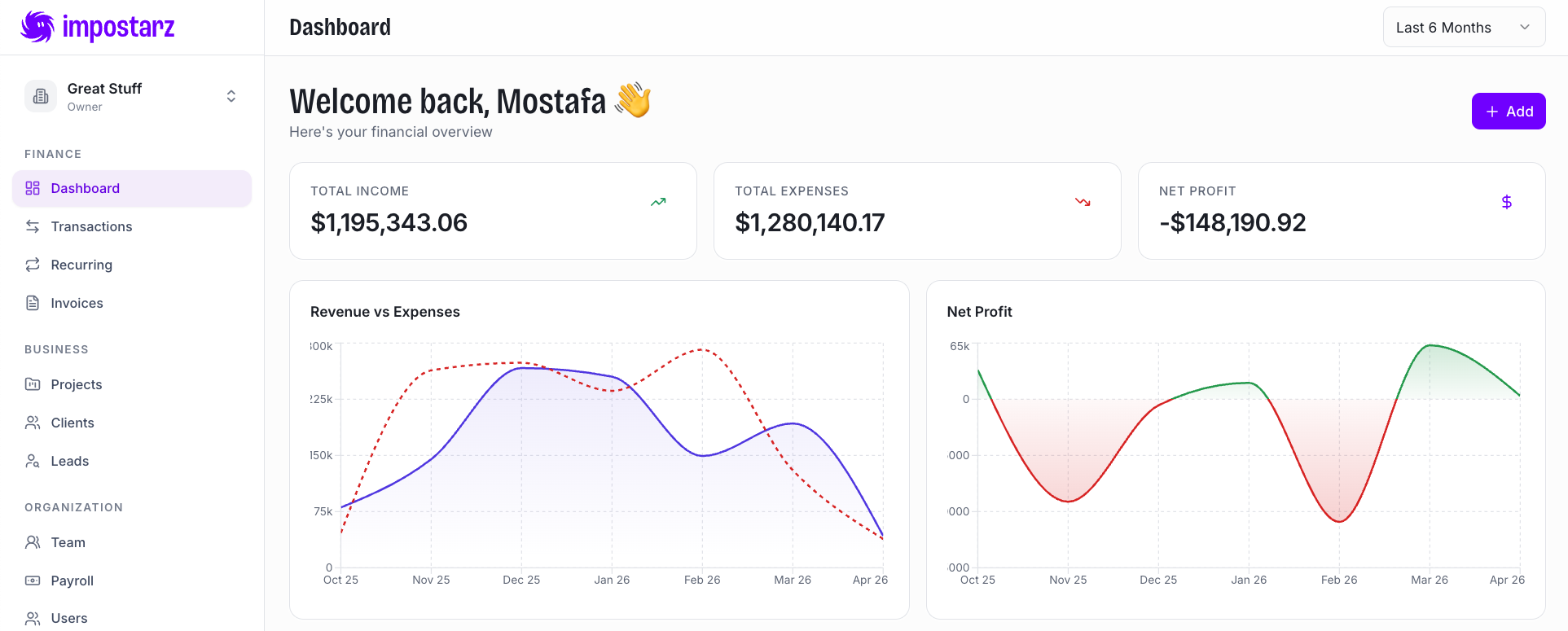 Impostarz replaces your chaotic spreadsheets with a clean, intuitive dashboard that shows exactly where your business stands—in seconds.